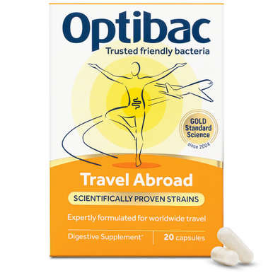 Box of Optibac Travel Abroad probiotics on a table with capsules beside it; lemons and a plant in the background.